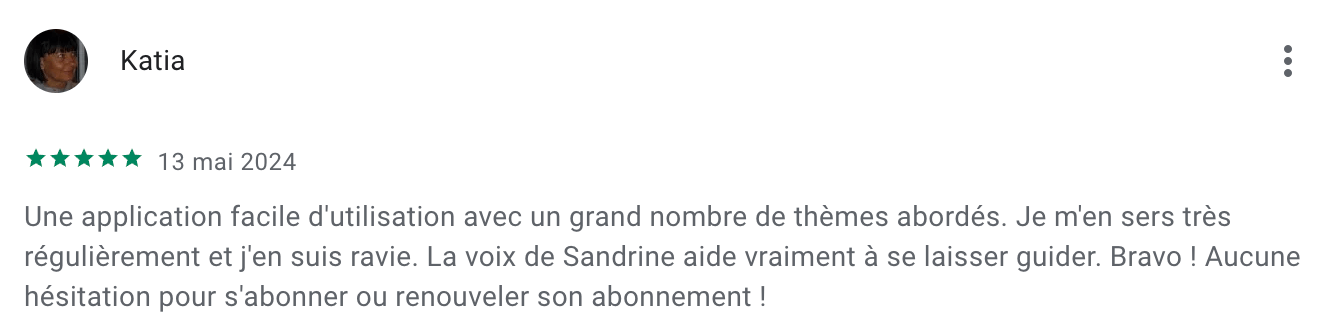 "J'aime beaucoup cette application que j'utilise quasiment tout les jours et surtout la voix tellement douce et apaisante et bienveillante de Sandrine."